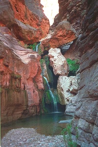 The trail climbs out of Royal Arch Canyon and onto the Tonto Plateau. A rappel of about 20 feet is required in the cliffs on the way down to the river. The trail reaches the river at the Toltec drainage, which is a good camping spot. An extra night here will allow you an easy day hike west to the pools and waterfalls of Elves Chasm, which is off-limits to camping. Its about an hours hike each way. Wear gloves to protect your hands from the jagged travertine limestone boulders you come in contact with along the way. And take a water bag to stock up on creek water; unless it has rained recently, youll probably be drinking river water at Toltec.
