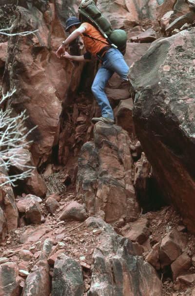 Unlike most other canyon routes, this one does not make a beeline down to the river. That was a relief for our aging muscles and joints when Barb, Stan and Joe did this route in March 1994. You follow the South Bass Trail for only about 1,200 feet of vertical descent, then exit onto the level and scenic Esplanade trail and head west to Royal Arch Canyon. The map that comes with the Backcountry Trip Planner shows where the trail enters Royal Arch Canyon. Be sure you mark the spot on whatever map you carry with you. We hadnt, and we wasted 90 minutes descending the wrong arm of Royal Arch Canyon and backtracking.